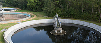 In den Belebungsbecken entsteht ein Gemisch aus Wasser und dem sogenannten Belebtschlamm, in dem sich die wertvollen Mikroorganismen befinden. Dieses Gemisch fließt nach der biologischen Reinigung in die vier Nachklärbecken unserer Anlage. Diese Becken fungieren als Absetz- oder Ruhebecken. Der Belebtschlamm setzt sich langsam am Boden ab und ein Schildräumer schiebt ihn dort in einer ebenfalls ganz langsamen, aber kontinuierlichen Bewegung zusammen.